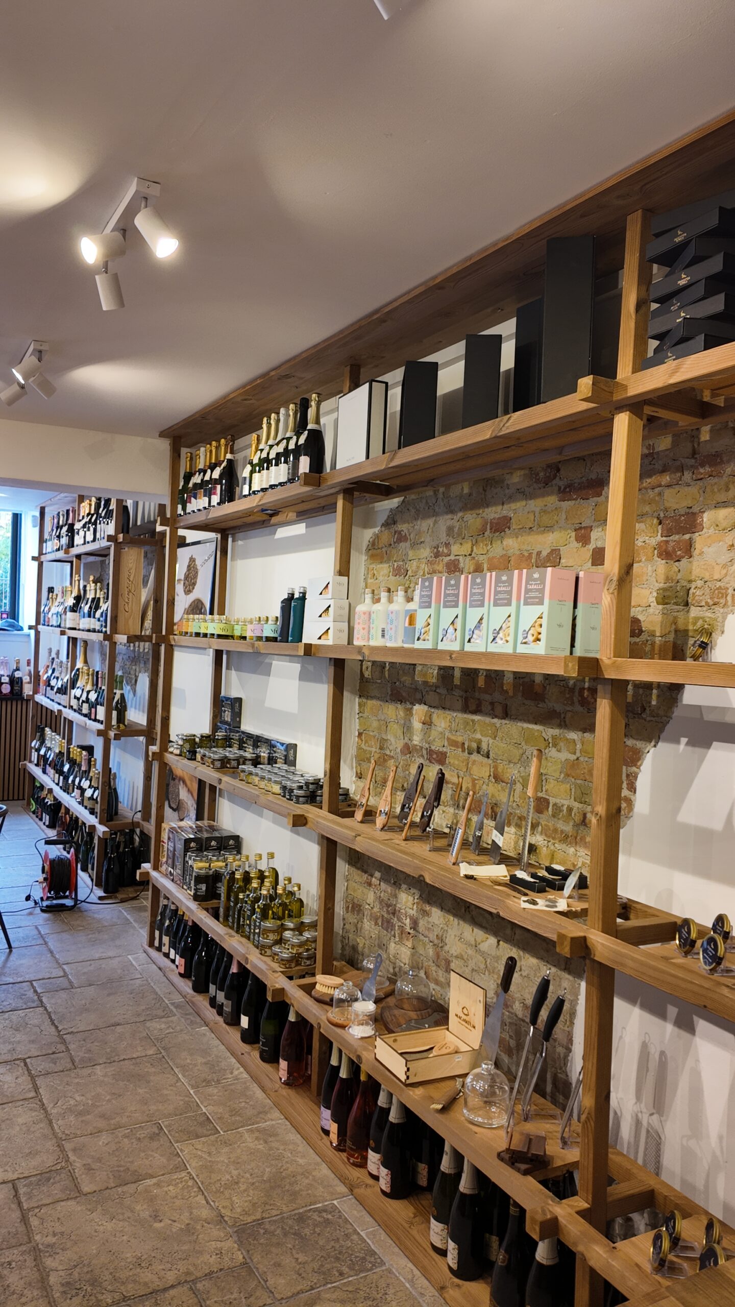 The backbone of the concept is a timber grid: vertical posts and horizontal shelves that lock visually into the brick background. That grid creates rhythm along the wall, so whether the shelf holds 60 champagne bottles, a line of truffle oils, or premium caviar gift sets, the presentation still looks composed. Because the store works both as a showroom and as a pick-up point for online orders, flexible display was essential.